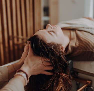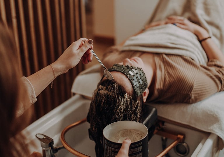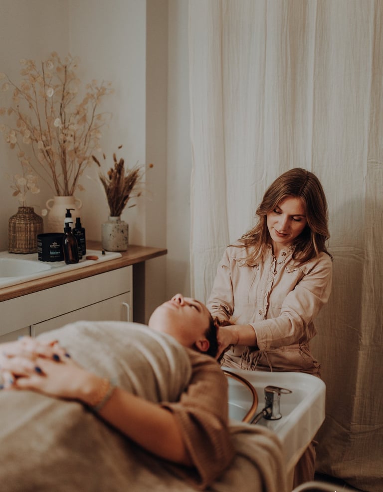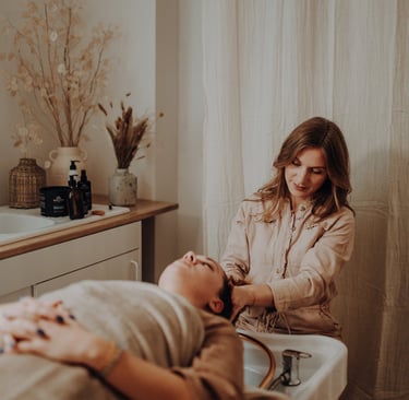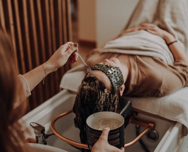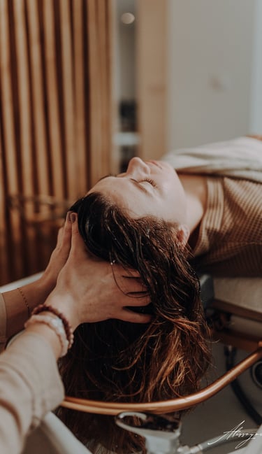 Le massage du cuir chevelu en position allongé aide à détendre les tensions, tandis que les produits naturels apportent des bienfaits réparateurs et apaisants.